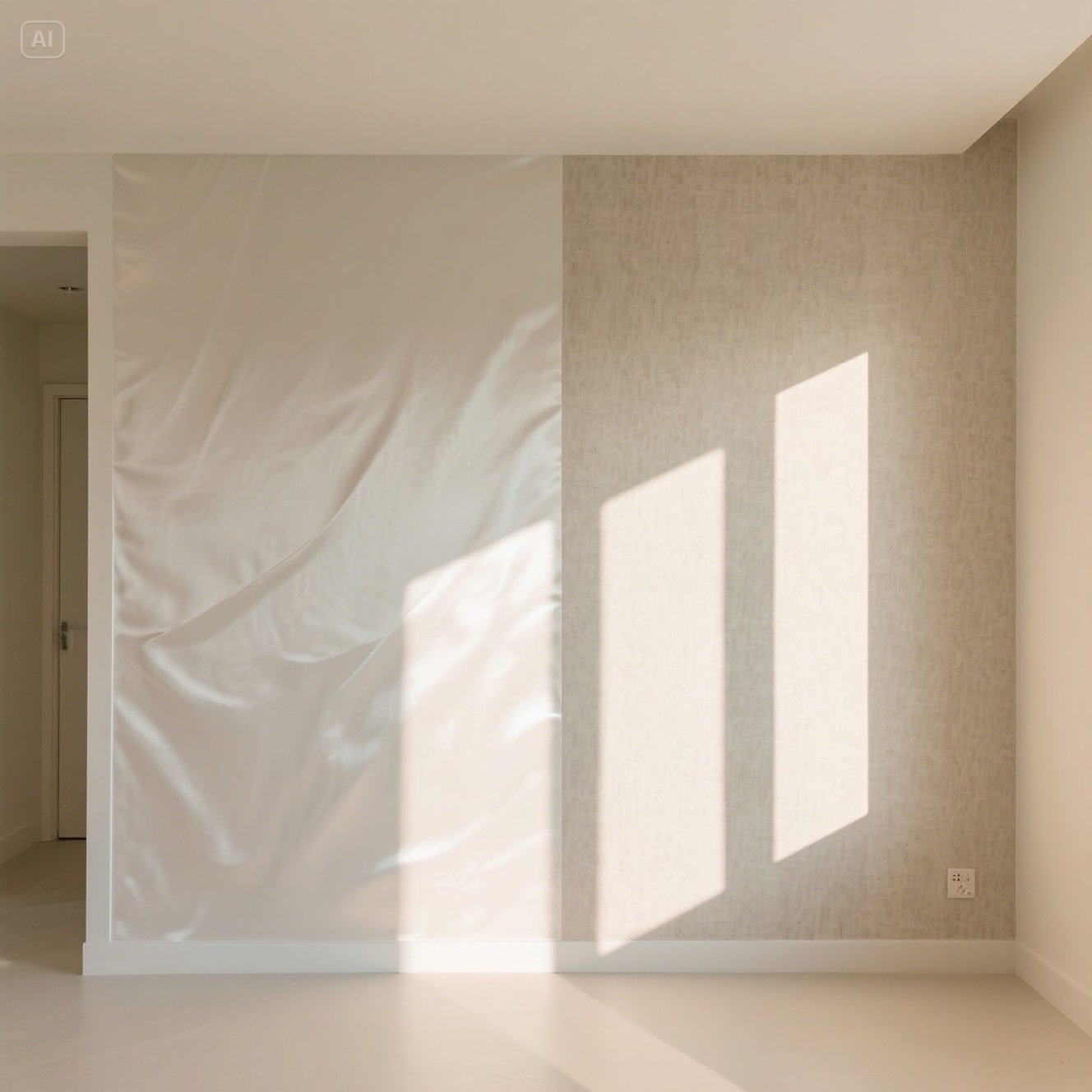 - 실크 벽지와 합지 벽지를 같은 벽면에 시공한 비교 컷